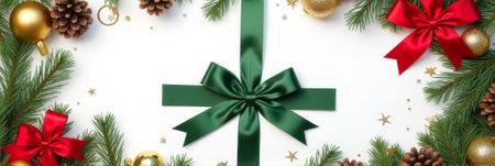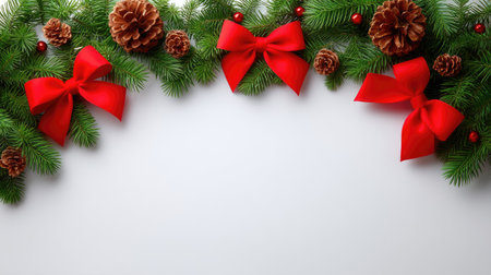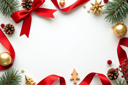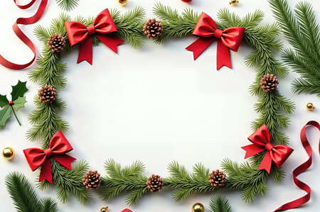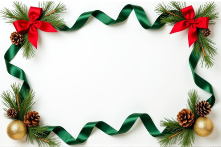 Festive christmas frame with green ribbon, red bows, pine cones, and golden ornaments.
