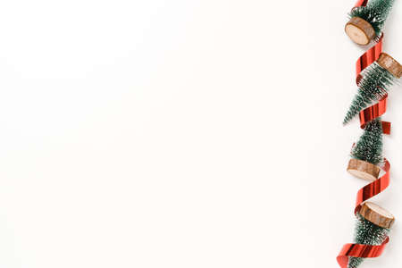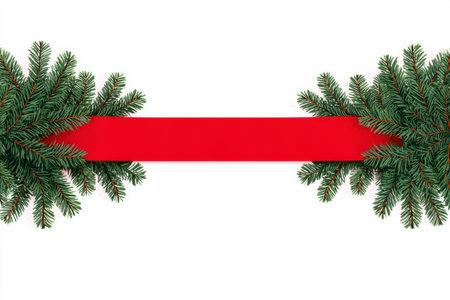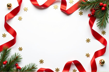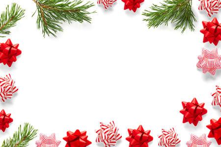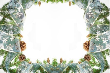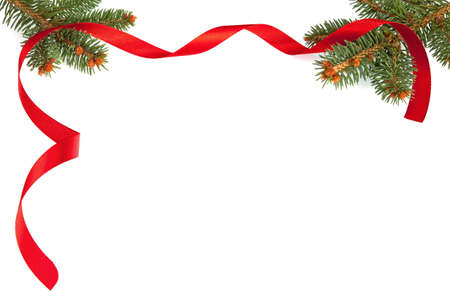 White bright Christmas frame consisting pines from fur tree and red ribbon, including negative empty space for text