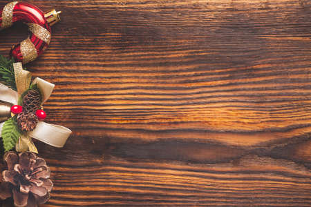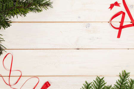 Christmas background on wood with fir twigs, colorful trinkets and ribbons. Top view with space for your text.