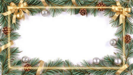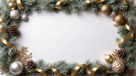 A soft Christmas border crafted from pine needles and metallic baubles around a bright white center.