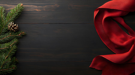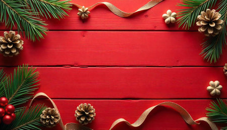 A lush pine branch with a pine cone and a flowing red ribbon are set against a dark wooden background. This arrangement creates a rich and traditional holiday atmosphere.