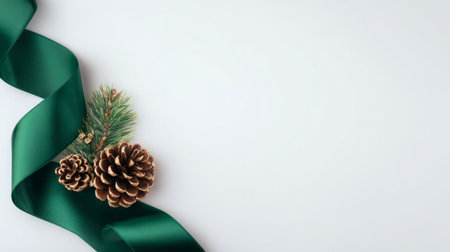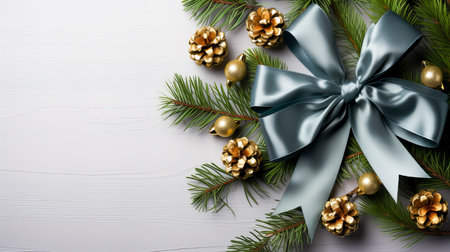 Christmas composition of coniferous tree branches, pine cones and silver ribbon next to the white Copy space