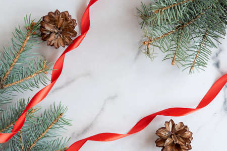 Christmas and new year greeting card with copy space. Blue conifer branches, cones and red sattin ribbon arranged on white marble background.