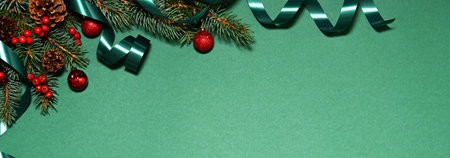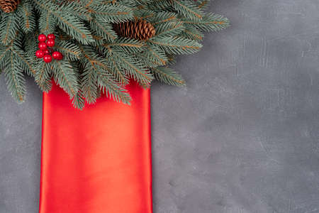 Christmas border branches of fir tree with decoration and red winter berries. Background with copy space with red silk textile and Christmas wreath
