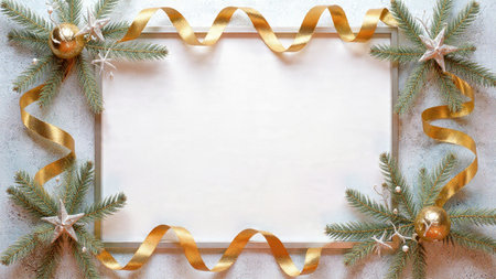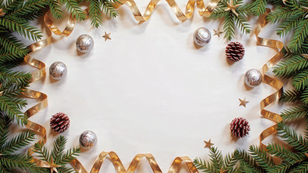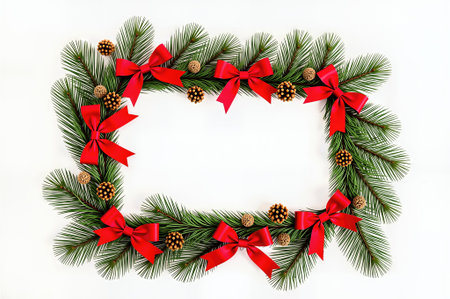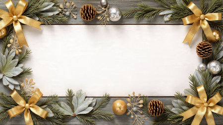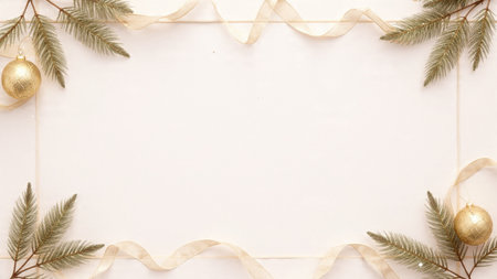 Beautiful arrangement of pine needles, bows, and golden ornaments creating a stunning border on a neutral background perfect for seasonal designs