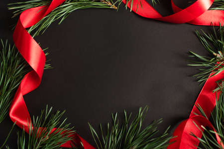 Christmas composition of fir branches and a gold ribbon in the form of a frame with a place for text on a black oil with gold embossing background.