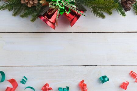 christmas bell fir geeen ribbon with text happy christmas on wooden