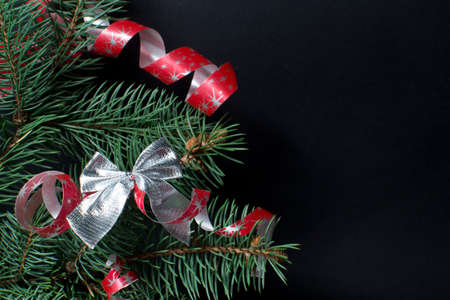 coniferous branches and Christmas tree decorations on a New Year's dark background, copy space.