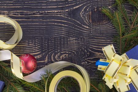 Space. Text. Wooden dark background on it wood texture. Around the Christmas tree legs. Gift boxes with ribbon and bow. There is a Christmas tree decoration.