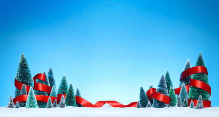 Winter wonderland with miniature tree decorations wrapped in a shiny red ribbon on sparkling snow.