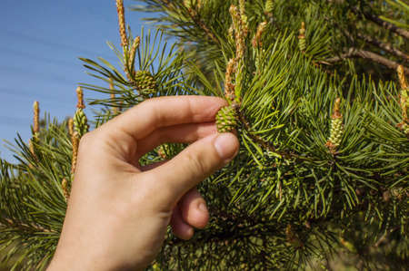 Man collects spring green pine cones close-up