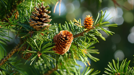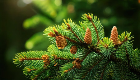A striking close-up of a pine tree branch displaying fresh green needles and emerging cones. The blurred background creates a serene atmosphere, ideal for nature-themed projects.