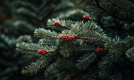 Spruce branches with cones and red berries. Blurred background.
