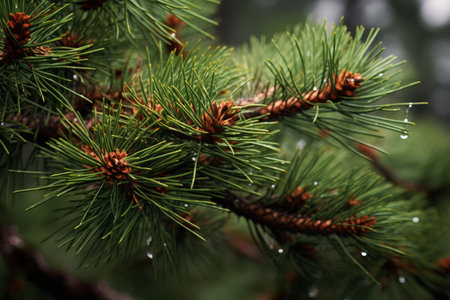 Detailed view of a pine branch with fresh dew drops glistening in soft lighting