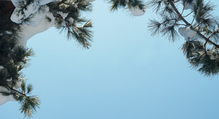 Frame of pine branches in snow on blue sky