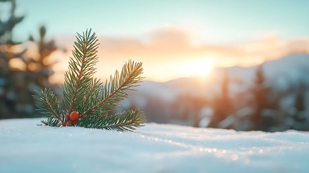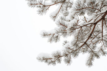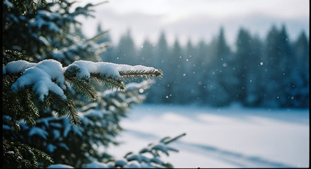 Photography captures snow-laden pine branches with frost, contrasted by a rich green background, evoking a tranquil winter atmosphere with copy space for text