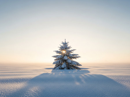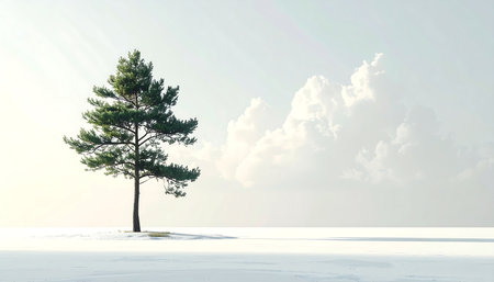 Minimalist winter landscape featuring a solitary pine tree in a snow covered field, creating a serene and tranquil atmosphere