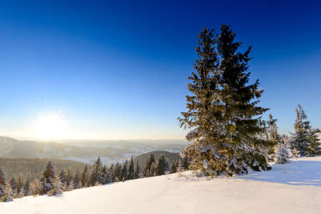 Beautiful winter landscape with snow covered fir trees in the mountains.