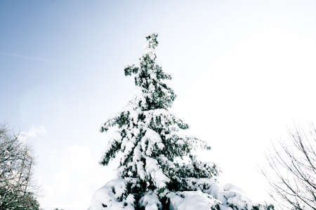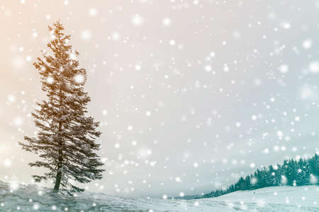 Christmas tree in snow. Winter landscape. Christmas background. Happy New Year.