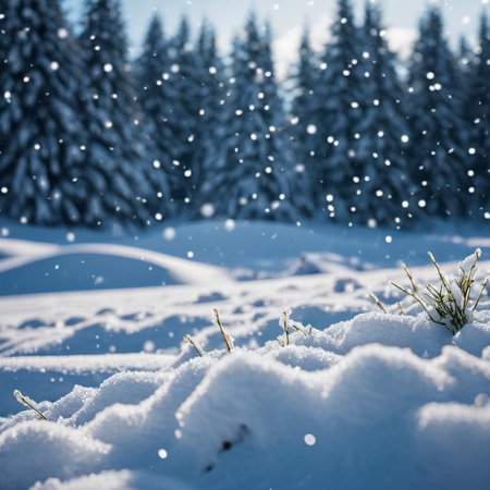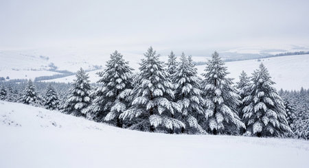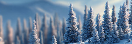 A serene winter landscape featuring snow-covered pine trees under a clear blue sky. This tranquil scene captures the beauty of nature in the cold season.