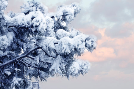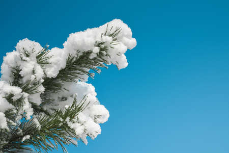 Winter background with pine tree branch covered with snow