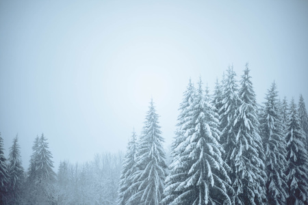 Snowstorm in winter mountains. Snowy spruce and pine forest. Landscape photography