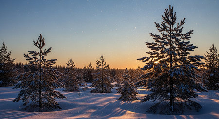Winter landscape with snow covered fir trees and starry sky at sunset