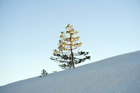 Winter landscape. Tall pine tree alone on mountain slope on cold sunny day on copy space background of blue sky and spruce forest.