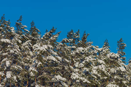 Winter forest landscape. Snow in forest. Cold winter weather. Coniferous forest background. Blue sky tree tops texture. Tree crown background.