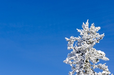 Snow covered pine trees against a blue sky background