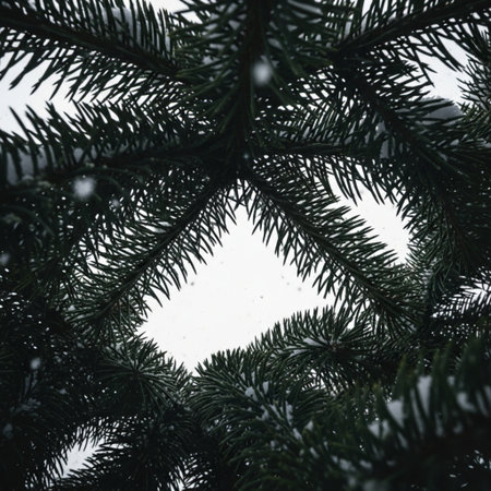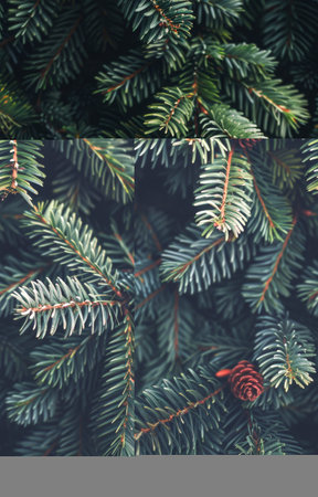 Close-up image of lush evergreen branches. The serene green hues and details intricately celebrate the beauty of winter nature.