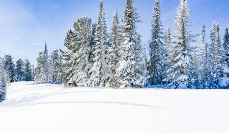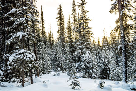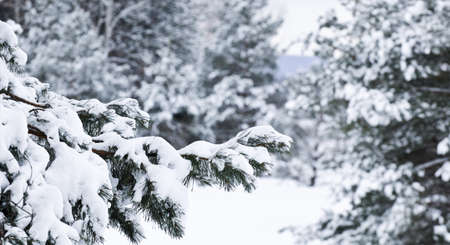 Winter in coniferous forest. Snow on pines, cold weather and frost