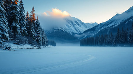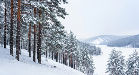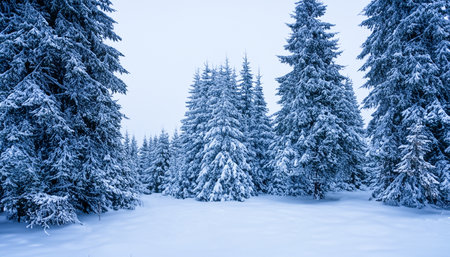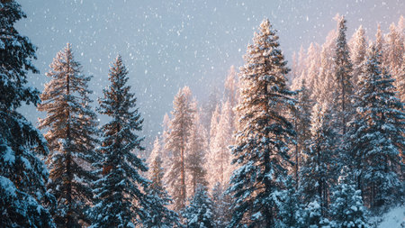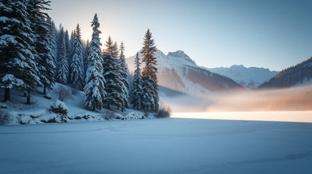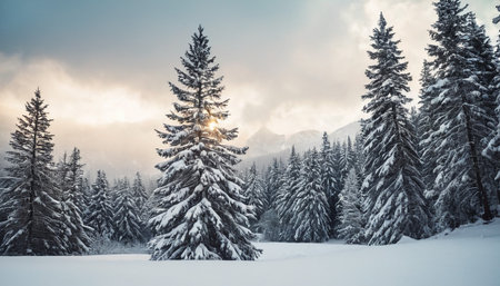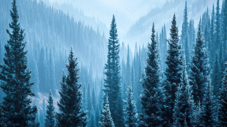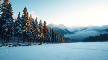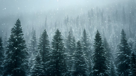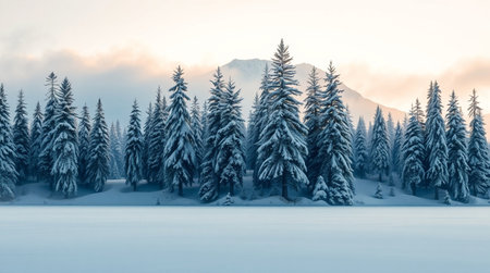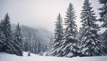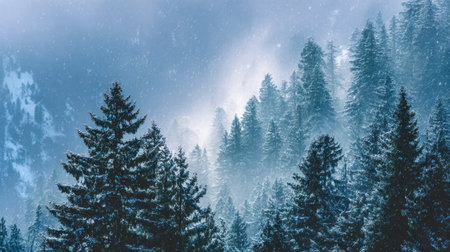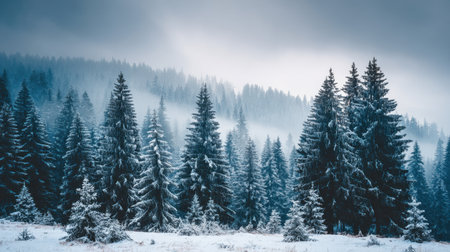 A breathtaking winter landscape featuring a misty forest of evergreen trees blanketed in snow, creating a tranquil scene filled with peaceful beauty and nature's serenity.
