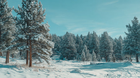 A serene winter landscape featuring snow-covered pine trees under a clear blue sky. This tranquil scene captures the beauty of nature in the cold season.