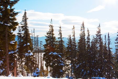 Beautiful winter landscape with snow covered fir trees and mountains in the background