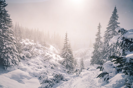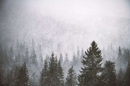 Snowstorm in winter mountains. Snowy spruce and pine forest. Landscape photography