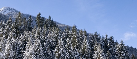 A serene winter landscape featuring a dense evergreen forest on a snowy mountain slope.