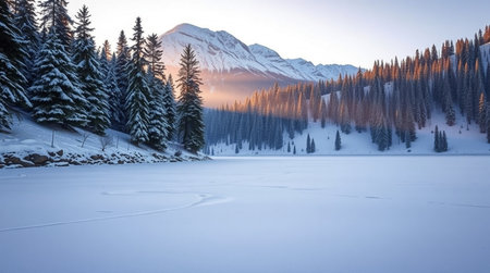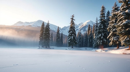 In the crisp morning air, a pristine snow-covered pine forest awakens to the soft light of dawn, its frosted branches shimmering with icy beauty, a tranquil haven untouched by time.. AI generated.