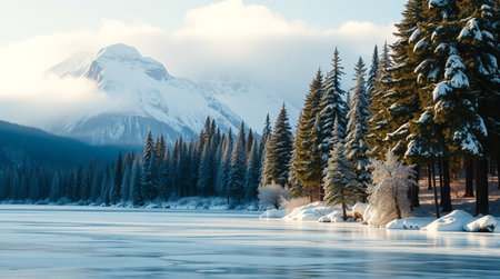 Serene Snowy Winter Forest Landscape with Majestic Pine Trees and a Tranquil Frozen Lake