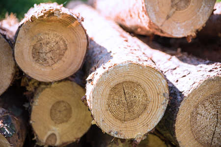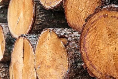 Closeup of logs of trees in nature. a lot of cutted logs.
