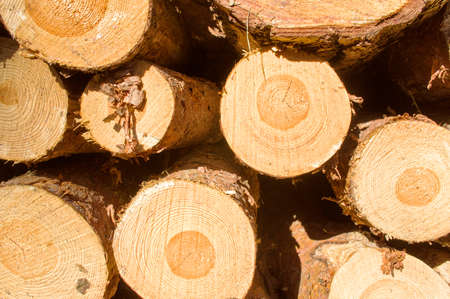 Forest pine trees log trunks felled by the logging timber industry round form