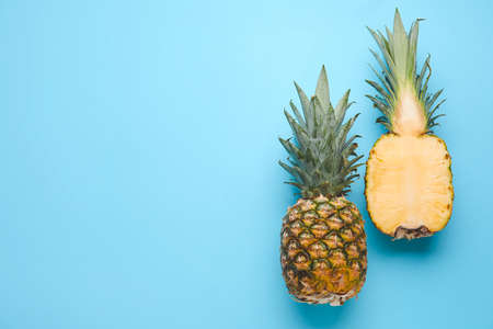 Pine apple tropical fruit on blue background. Raw eating concept Summer time. Season local super food product of Thailand. Flat lay top view
