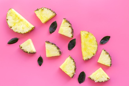 Exotic fruits pattern. Pinneapple slices and small leaves on pink background top view copyspace