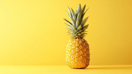 A ripe pineapple with vivid green leaves sits upright, showing its textured skin beneath soft, natural light against a lively yellow backdrop.