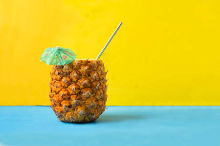 Ripe pineapple on a yellow background. copyspace. Summer vacation concept.