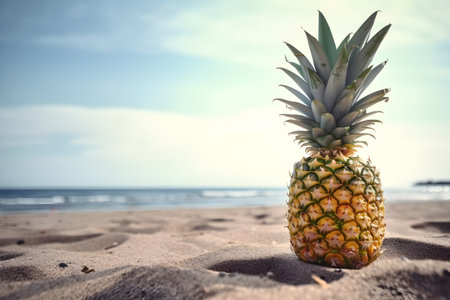Pineapple on the sand on the seashore with copy space. Concept of summer holidays. Generative AI.