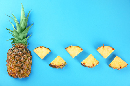Pine apple tropical fruit on blue background. Raw eating concept Summer time. Season local super food product of Thailand. Flat lay top view