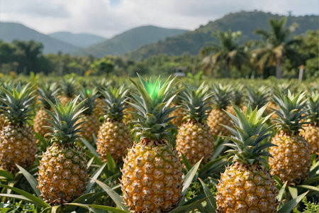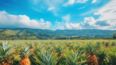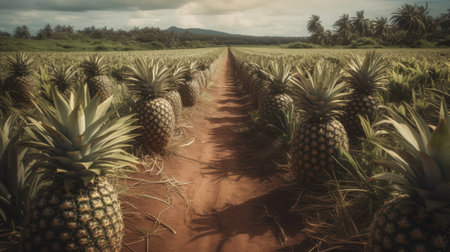 A vibrant pineapple plantation basks in the tropical sun Lush green foliage stretches as far as the eye can see, interspersed with rows of plump, ripe pineapples The air is thick with the sweet scent of the fruit, promising a taste of paradise AI Generative