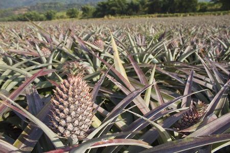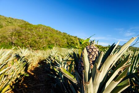 Pineapple field in the morning. Close-up of fresh ripe pineapple.