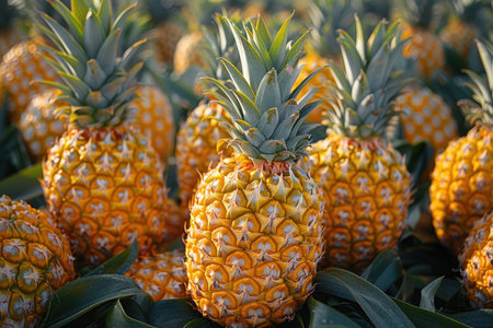 Close-up of fresh, ripe pineapples with lush green leaves, showcasing the tropical fruit in its natural habitat. Perfect for food, agriculture, and tropical themes.